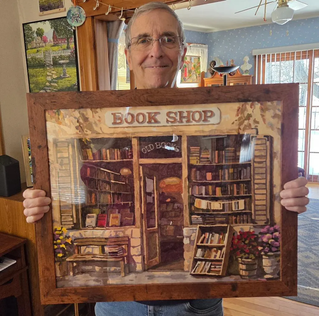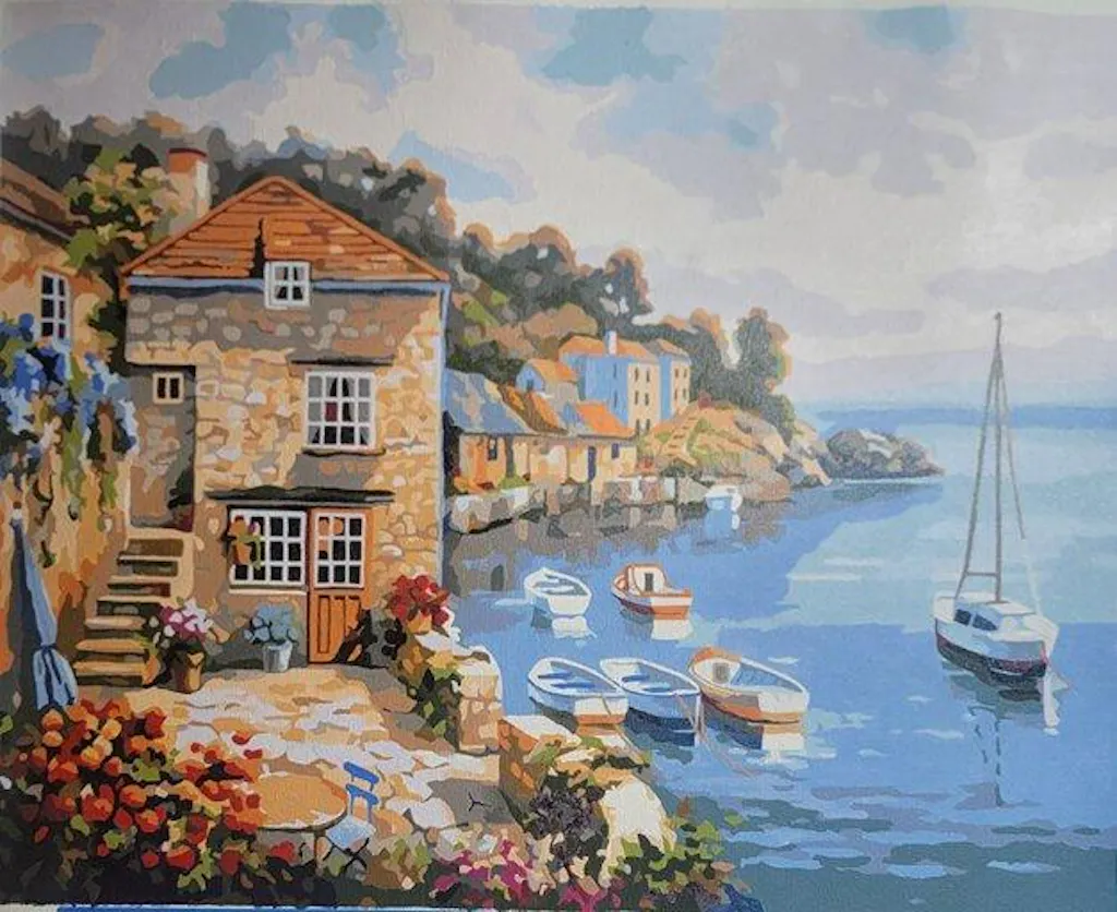 This painting was a little challenging with all the printing of names on buildings and trees. Loved seeing all the old tractors & trucks. Very pretty picture. Paints, canvas and instruction sheets were great as usual. I do wish you would make the painting lines & numbers a very light grey so they weren't so hard to cover. The painting turns out so pretty.