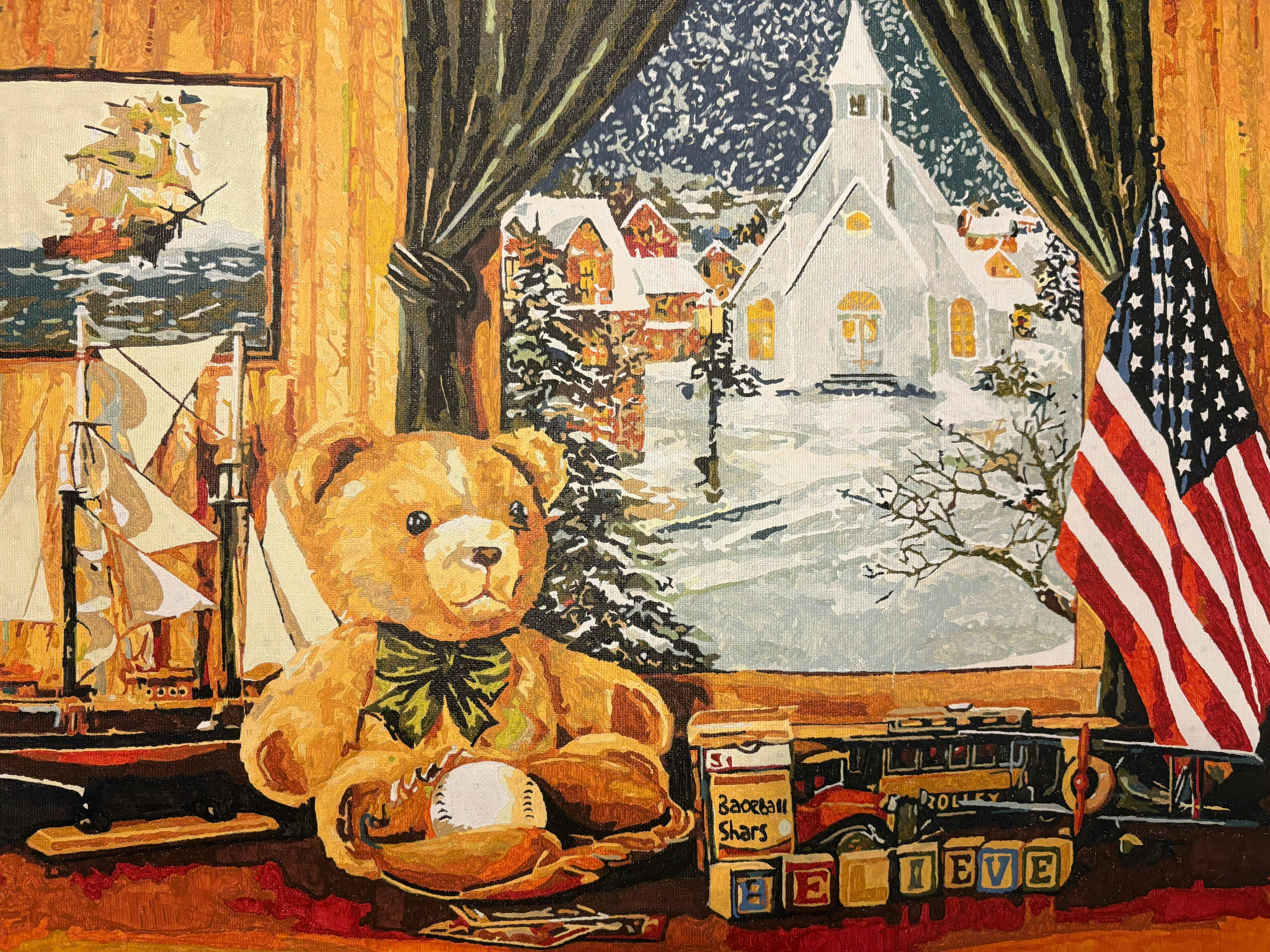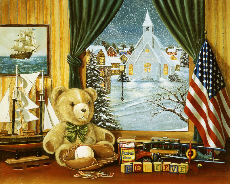Believe by H Hargrove - Experience the warmth of this nostalgic Christmas painting. Believe will transport you back to a simpler time with the joy and nostalgia of the Christmas spirit. Featuring the iconic American flag, a baseball mitt, and a model airplane, this piece captures the holiday spirit with charming wintery scene outside the window.