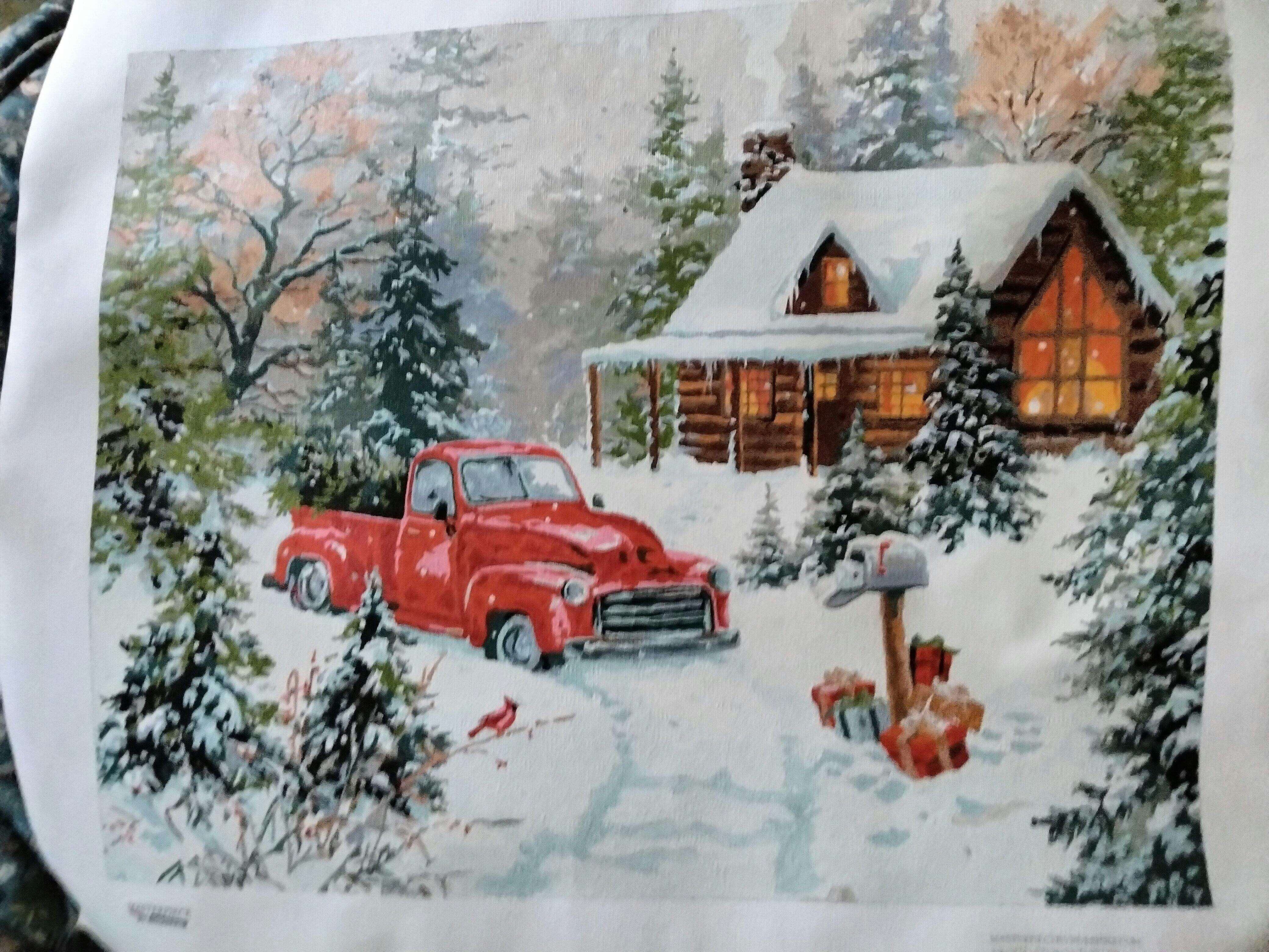 Christmas Tree Cabin by Abraham Hunter - This classic Christmas Tree Cabin has a charming red vintage truck and festive Christmas trees! It's time to enjoy a cosy winter getaway.