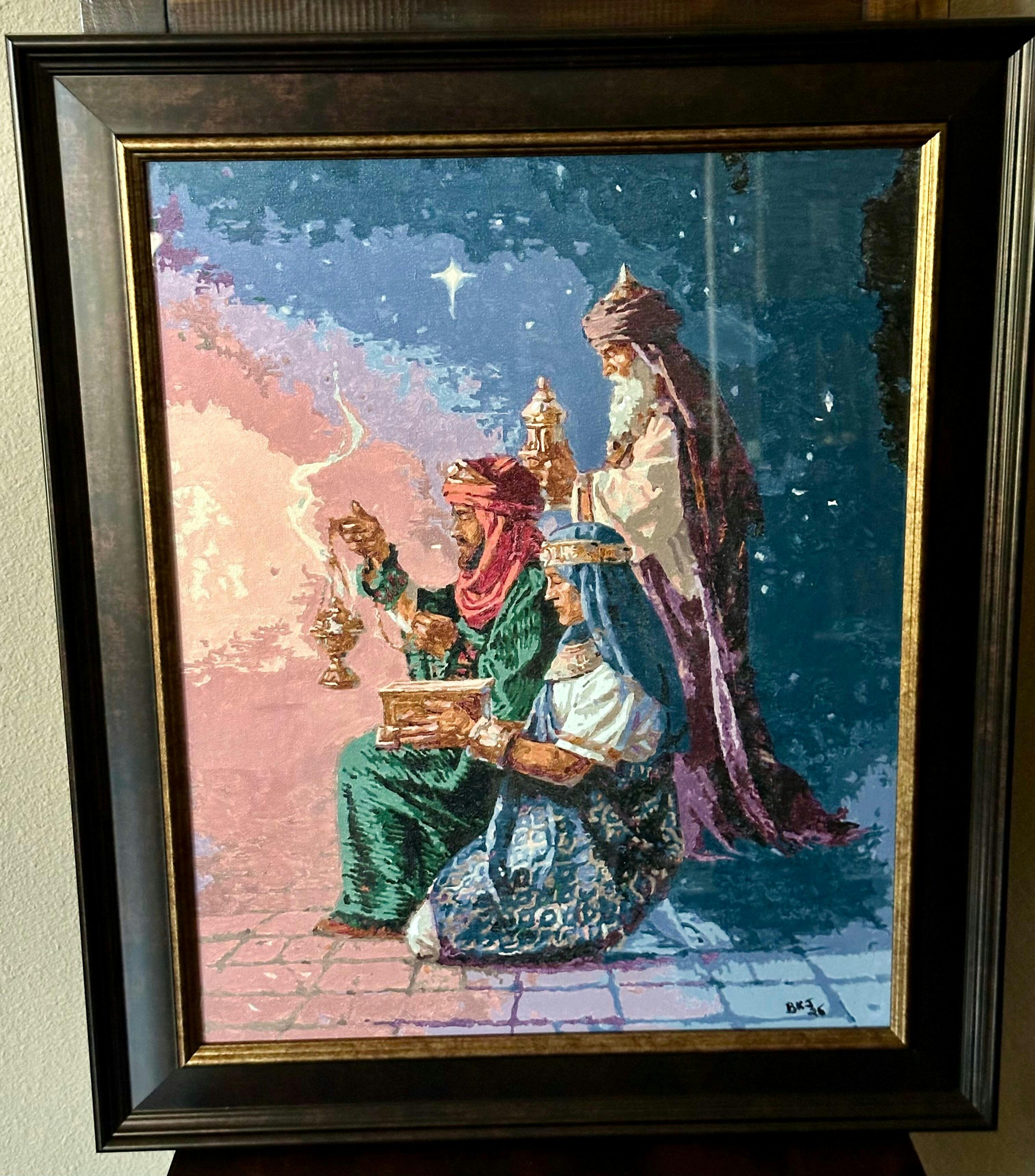 Gifts of the Magi by Corbert Gauthier- This painting captures the sacred moment when the three wise men arrive bearing gifts for the newborn Jesus. The scene is reverent and majestic—each Magi dressed in flowing robes of deep crimson, sapphire, and gold, symbolizing their royal origins and spiritual significance. They kneel in humble awe, presenting their treasures: gold, frankincense, and myrrh, each held delicately in ornate vessels.