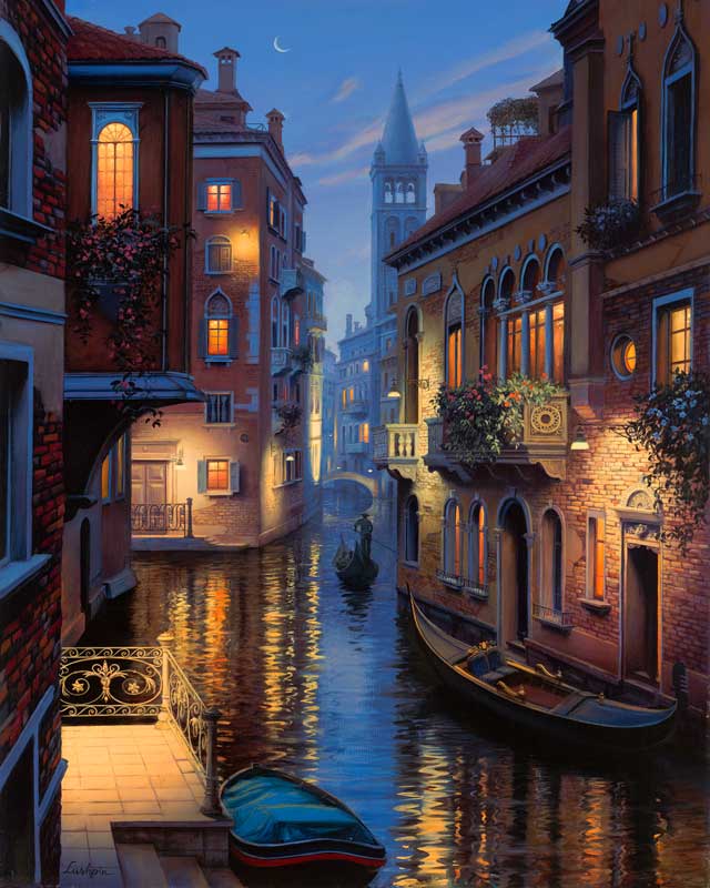 Venice Canal by Evgeny Lushpin - A peaceful canal running through Venice. The crescent moon offers little light but the homes lining the canal light the way.